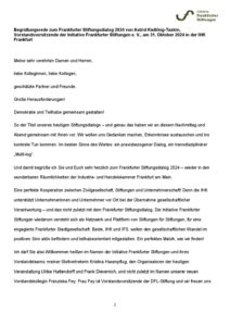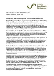 Am 31. Oktober 2024 laden die Initiative Frankfurter Stiftungen (IFS) e. V. und die IHK Frankfurt am Main Vertreterinnen und Vertreter von Stiftungen, Zivilgesellschaft sowie Förderpartnerinnen und Förderpartner zum Frankfurter Stiftungsdialog ein. Gemeinsam soll erörtert werden, wie gesellschaftlicher Zusammenhalt und demokratische Teilhabe in Zeiten